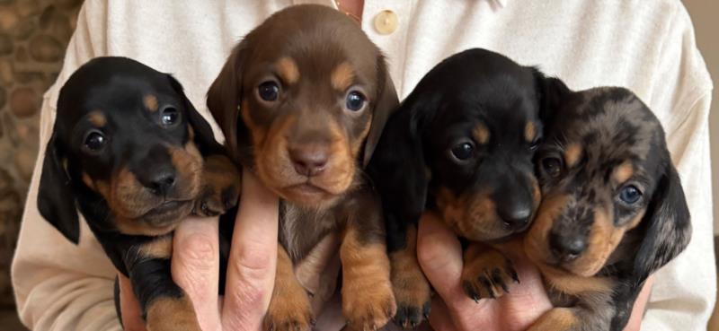 One black and tan female, one dapple and cream, female, one black and tan male and one solid chocolate male available.